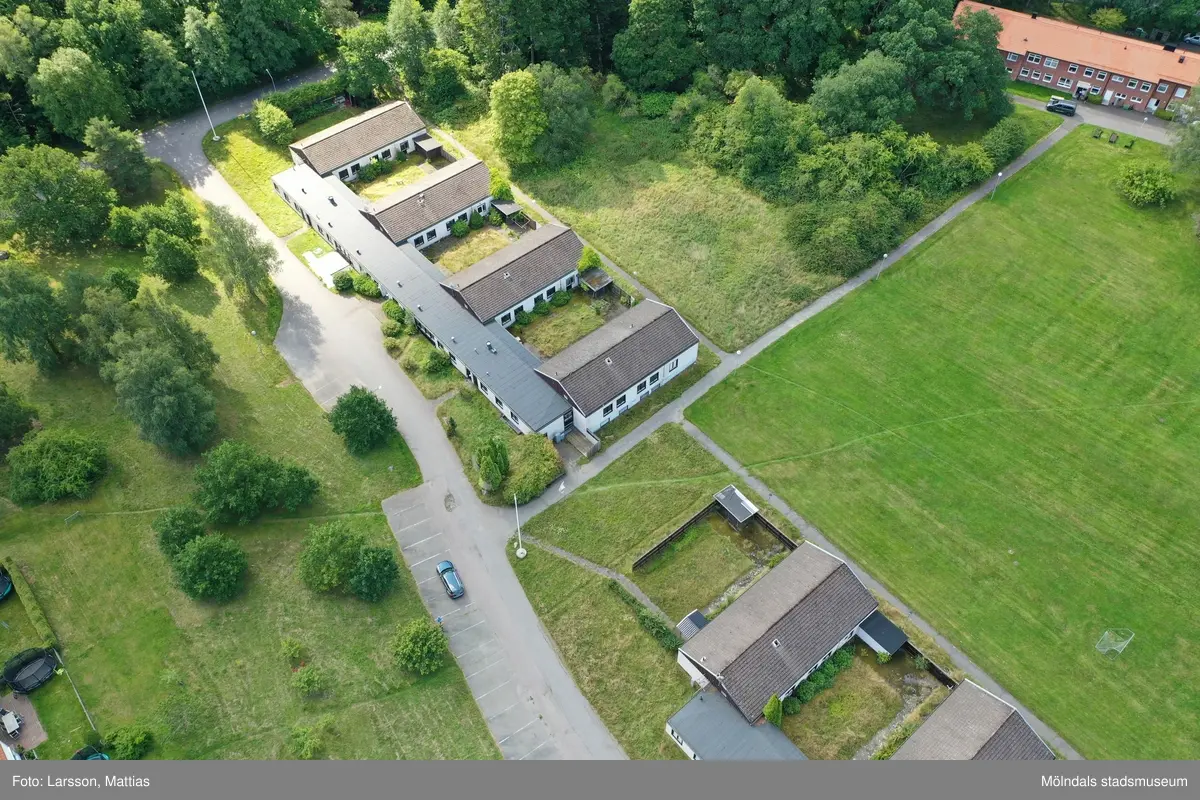 Flygfotografi som visar kamhuset Backegården samt del av Änggården, Stretered 1:106, med gatuadresser Ängbackevägen 13-19 och 21-27 i Stretered, Kållered, i Mölndals kommun. Vy mot söder. Byggnadsdokumentation inför rivning. Fotografi taget av Mattias Larsson, Borohus AB, den 23 augusti 2021.