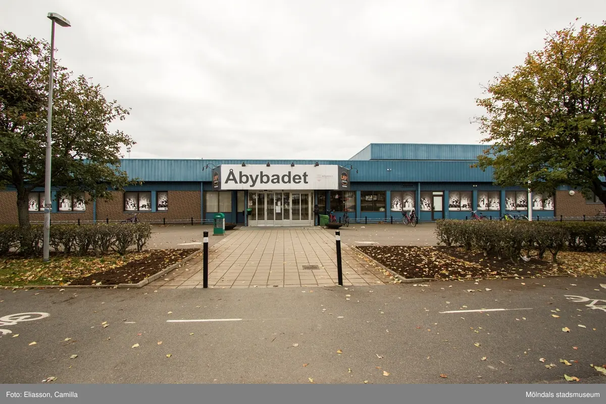 Entré till Åbybadet/Åby simhall med adress Idrottsvägen 9 i Åby, Mölndal, den 11 oktober 2016. Fasaden vetter mot norr. I förgrunden ses även cykelbanan som går längs Idrottsvägen.