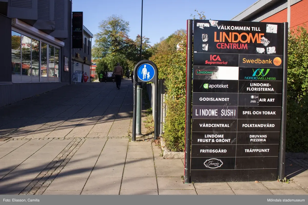 Almåsgången, sträckning västerut, i Lindome centrum den 4 oktober 2016. Till vänster ses huset Almåsgången 1 samt till höger nr 2, som inrymmer ICA Supermarket. Närmast till höger ses även en skylt som visar vilka affärsverksamheter som finns i centrum.