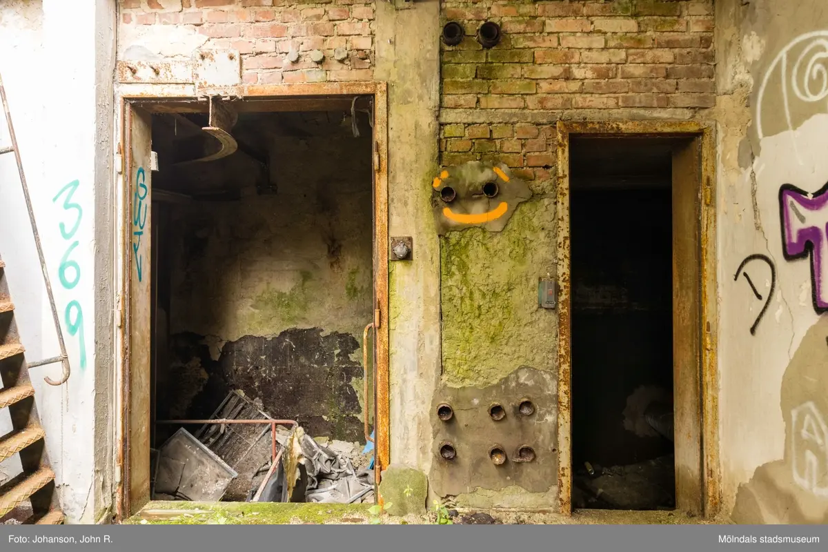 Industrilokal i fabriksbyggnaden Färgeriet på Annestorp 3:33 i Annestorp, Lindome, i Mölndals kommun. Vägg med två större öppningar samt med några utstickande rör. Byggnaden är rejält nedgången och väggarna är något nedklottrade. Byggnadsdokumentation inför rivning. Fotografi taget av John R. Johanson, Rstudio, den 29 oktober 2021.