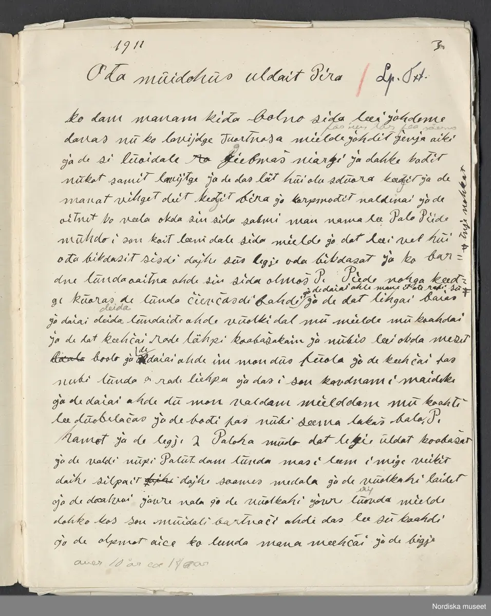 Uppslag ur manuskript/anteckningsbok med grönt omslag av Johan Turi, sidan 3, daterad 1911.