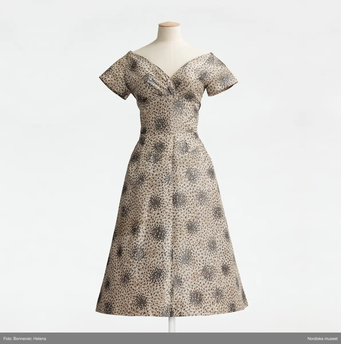 Klänning av vit sidentaft med tryckt prickmönster i ljusbrunt, ljusgrått och mörkgrått. Avskuren i midjan och under bysten. av Pierre Balmain, Paris, 1954.
