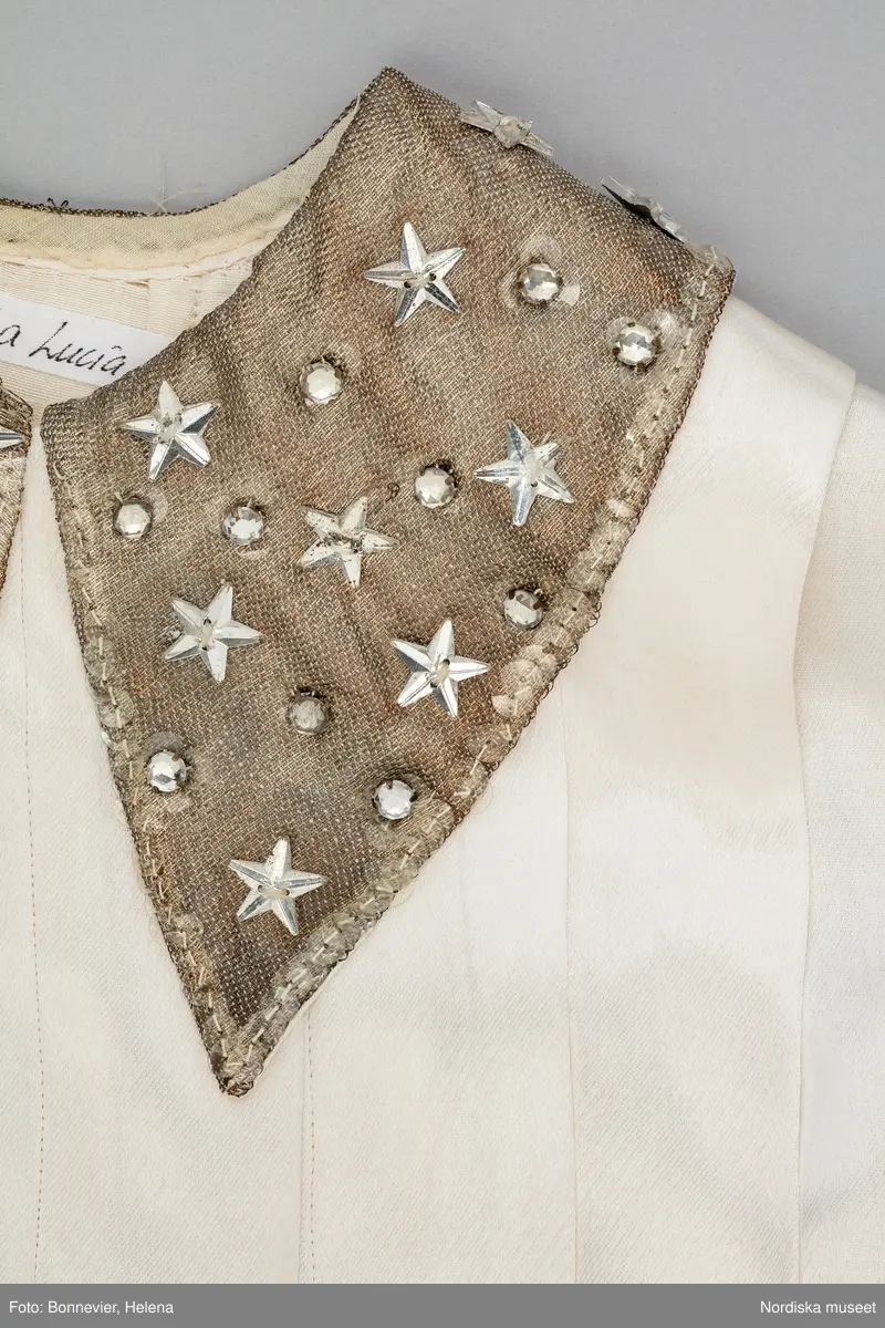 Detalj av lucianattlinne. Vitt liv med nedsydda veck, Kragen med stora snibbar i beige tyg med paljetter och pärlbroderier i form av stjärnor. Från NK:s Franska damskrädderi. I Skansens samlingar. SK17121.