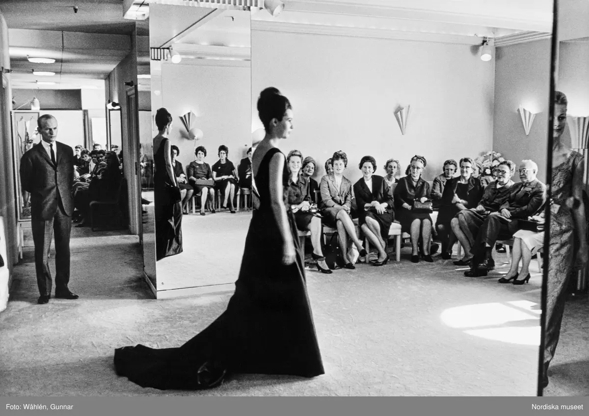 Mannekäng visar festmode, ärmlös aftonklänning med släp, på NK:s Franska damskrädderi för en samling presumtiva kunder. Merparten är medelålders kvinnor. Till vänster står Palle (Paul) Wikström och övervakar tillställningen. Hösten 1962.