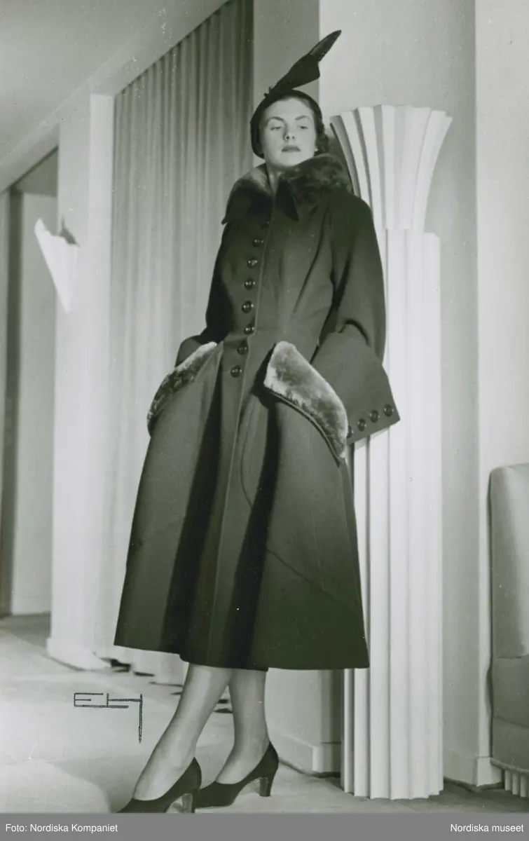 Modell i kappa med pälsdetaljer, fascinator och pumps av Jacques Fath. NK:s Franska damskrädderi.