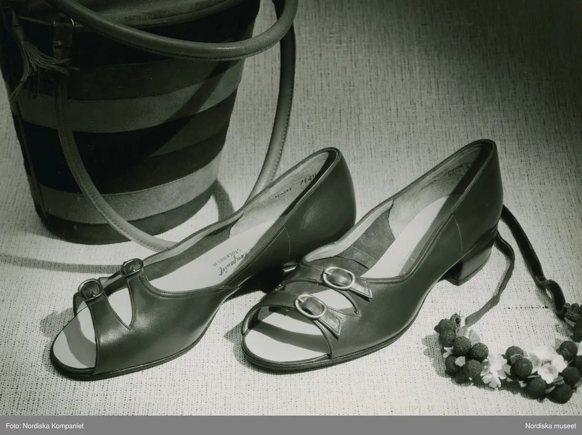 Sommarsko, skinn, öppen tå, låg klack. Randig väska. Halsband, textilblommor.