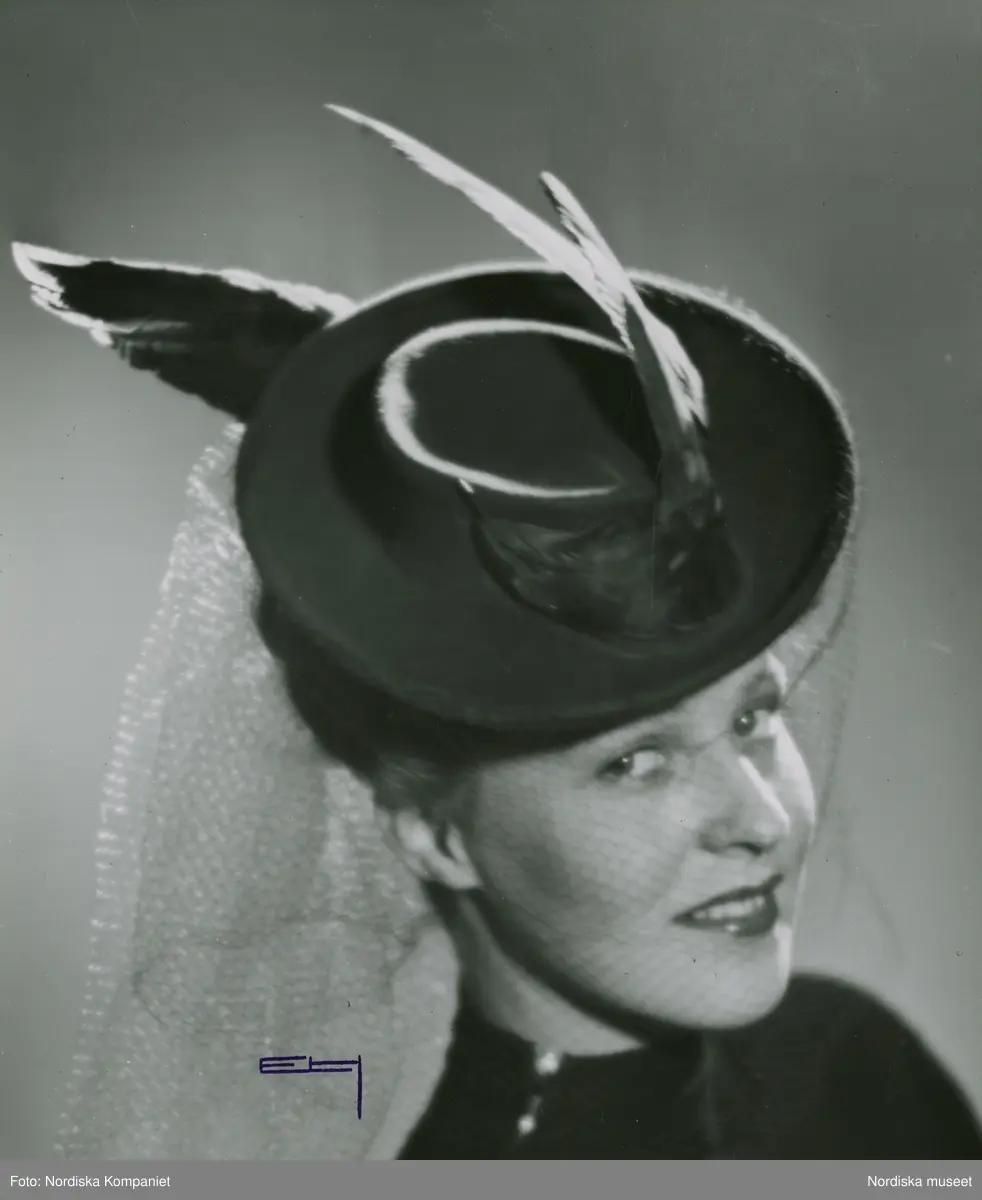 Modell i hatt med kulle och brätte. Dekorerad med fjädrar och flor.