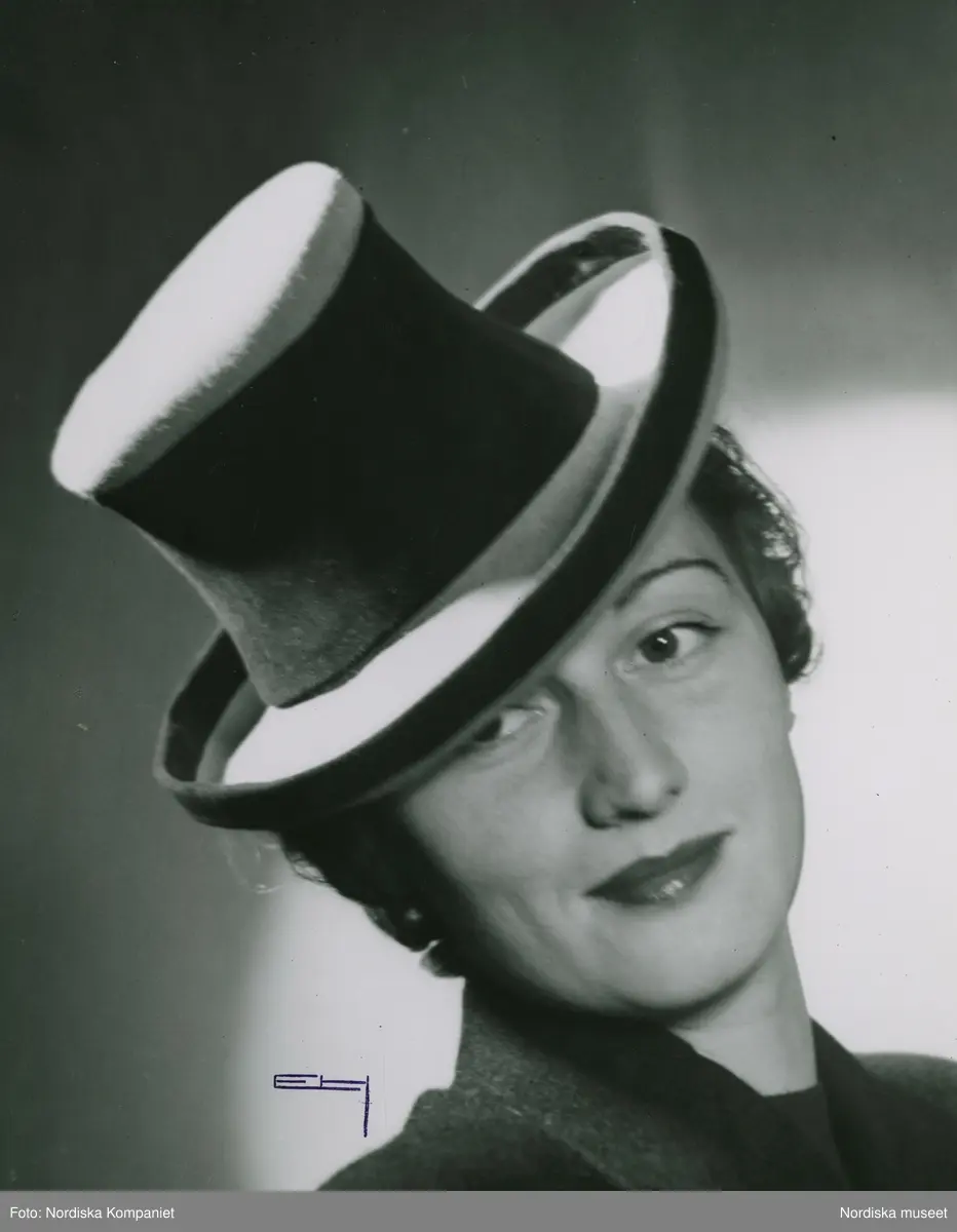 Modell i hatt med hög kulle och brätte. brett hattband, kantband.