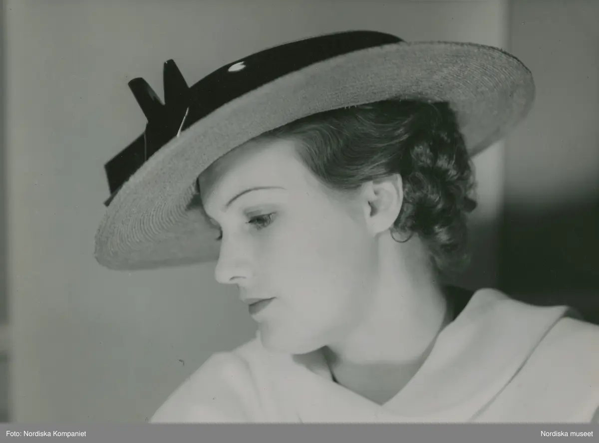 Modell i stråhatt, platt kulle och platt brätte. Hattband med rosett.