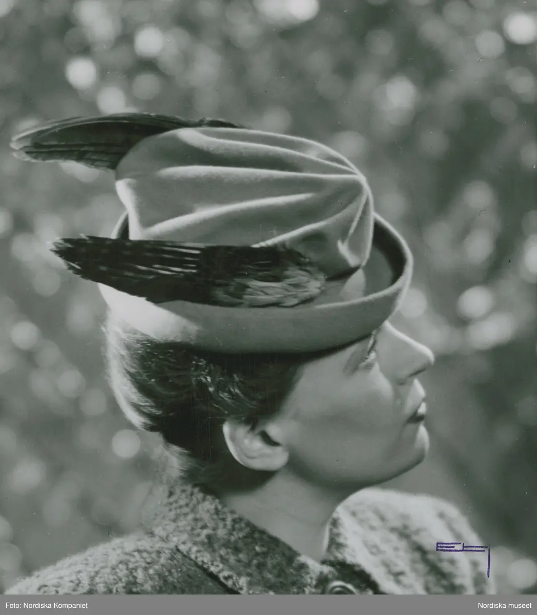 Modell i hatt med mjukt draperad kulle, uppvikt brätte. Fjädrar på sidorna.