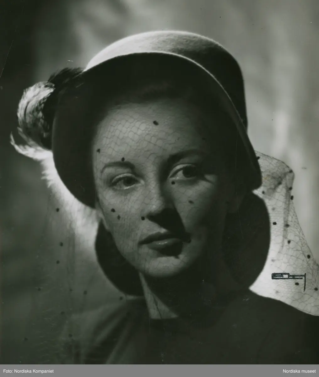 Modell i hatt med rund kulle, uppvikt brätte, flor, fjäder.