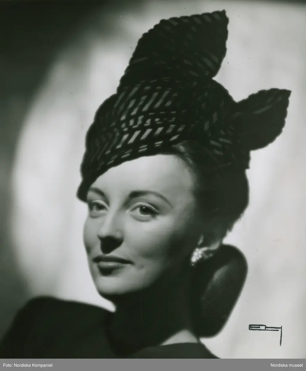 Modell i hatt av draperat randigt tyg. Två snibbar av tyget upprättstående.