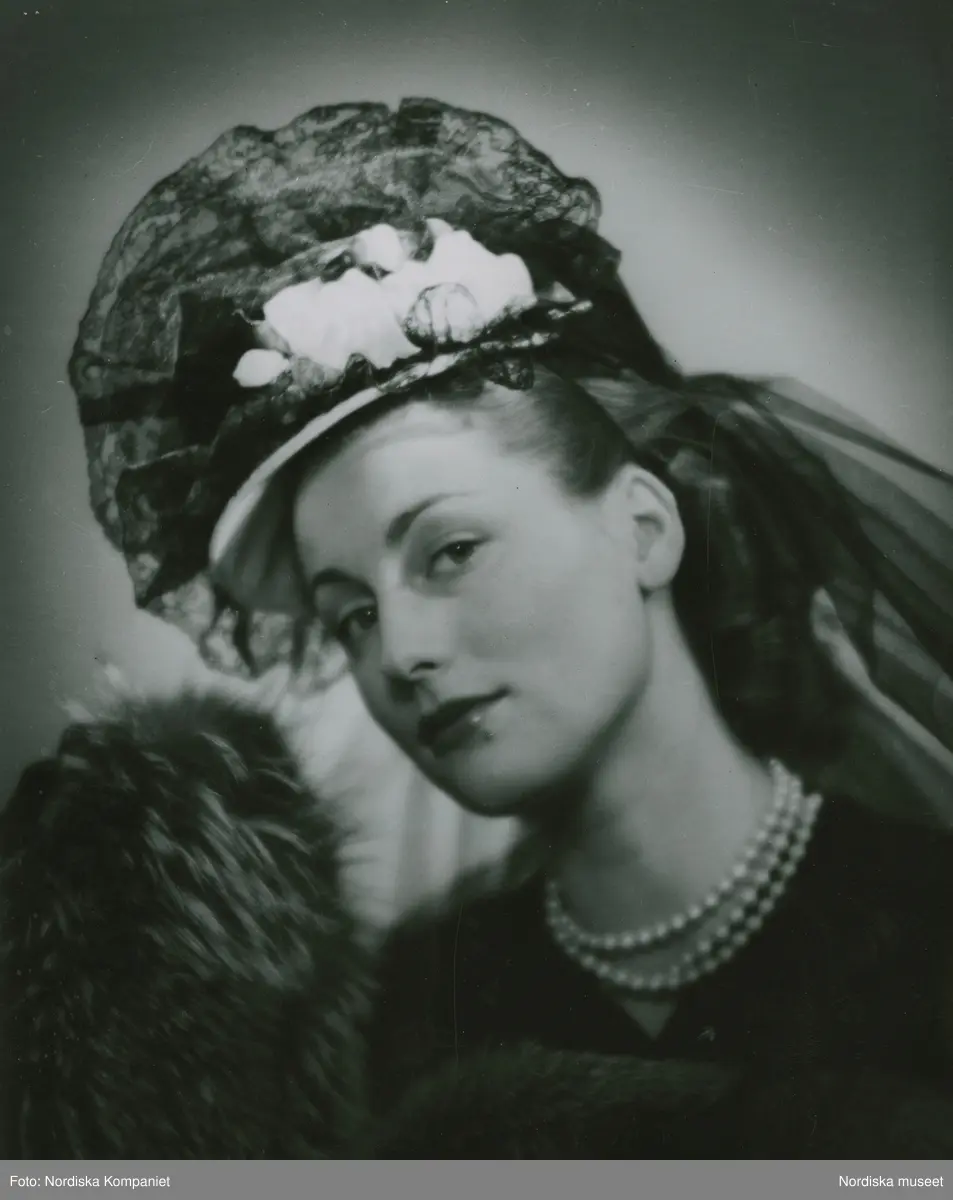 Modell i hatt dekorerad med spetsar och blommor. Flor nedhängande bak.