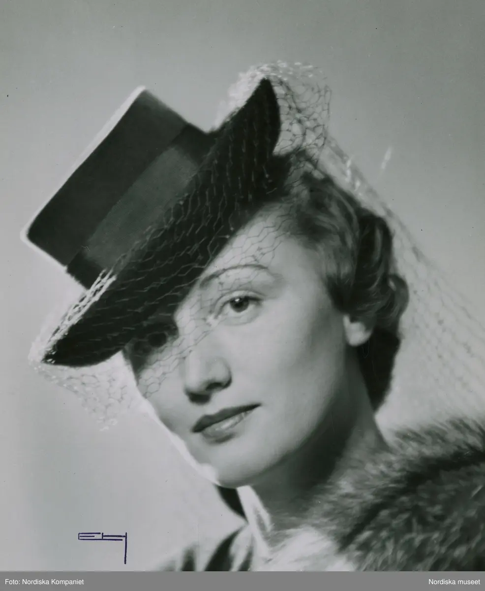 Modell i hatt med kulle och brätte med upvikta kanter. Hattband och flor.
