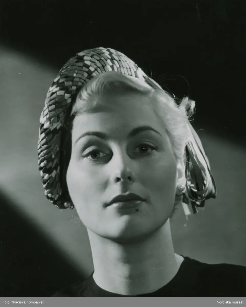 Porträtt av modell i fyrfärgad hatt med band och pärlörhängen.