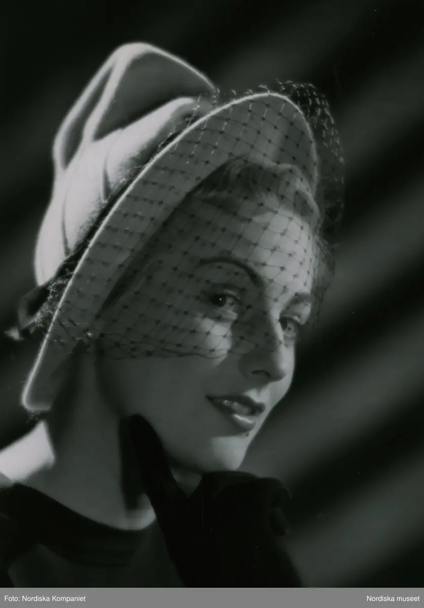 Porträtt av modell i svagt rosa filthatt med stickningar på kullen garnerad med marinblått band.