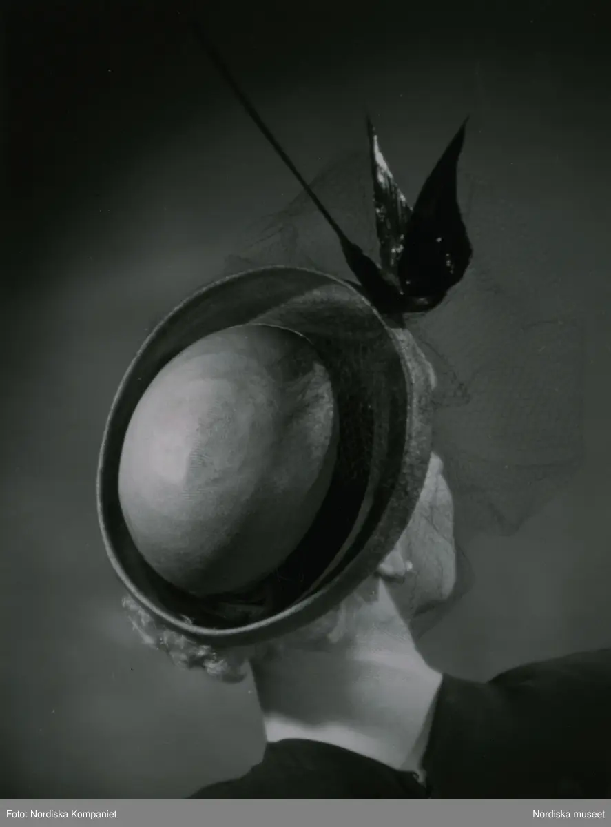 Porträtt av modell i röd stråhatt med lackfågel och lackband. Av Simone Cange.