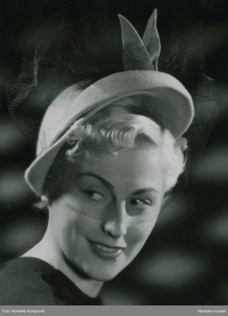 Porträtt av modell i rosa filthatt med skärmliknande brätte. Av Maud Roser.