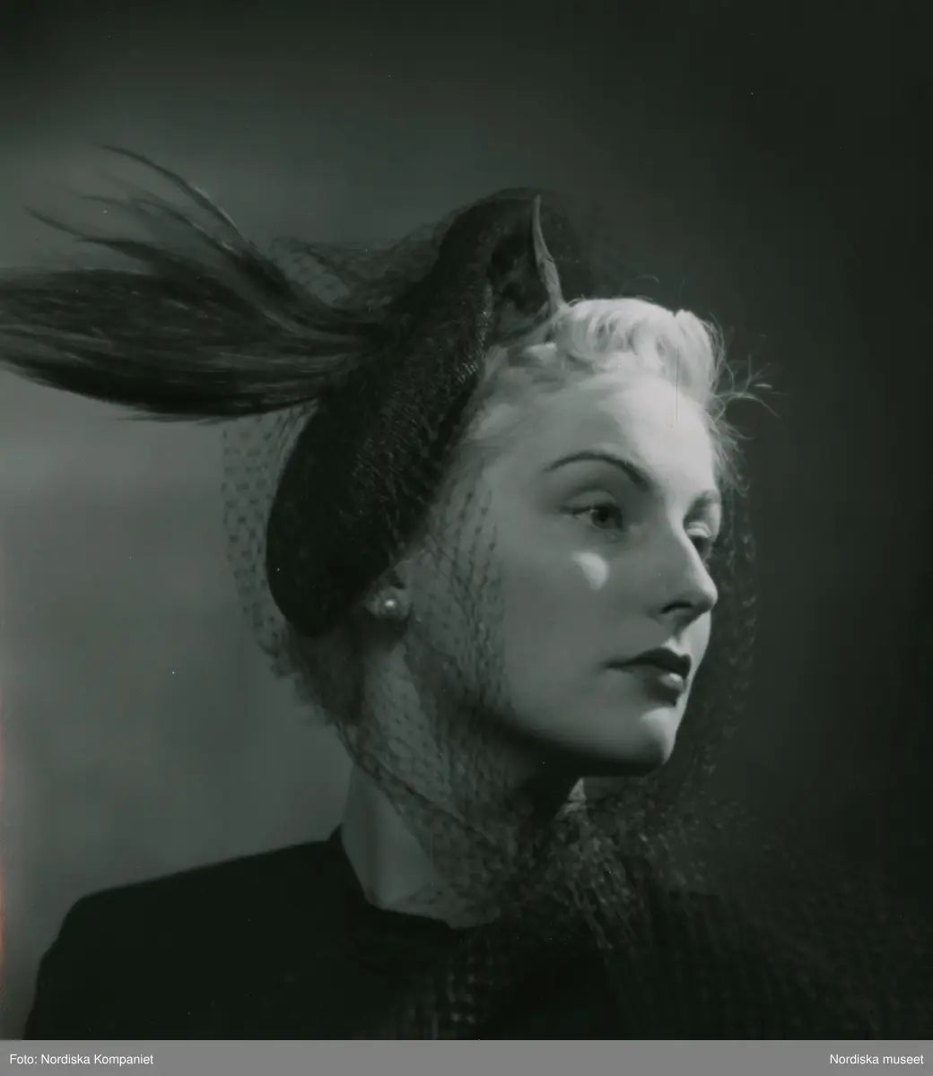Porträtt av modell i svart stråhatt med grön paradisfågel.