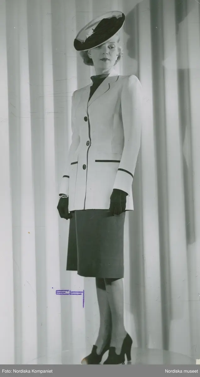 Modell i dräkt, hatt, handskar och pumps. Vår.