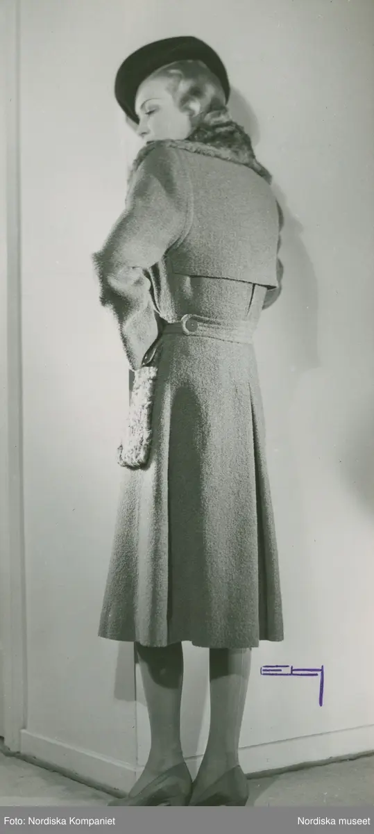 Modell i kappa med pälsfickor och basker, från Gaby Jouval.