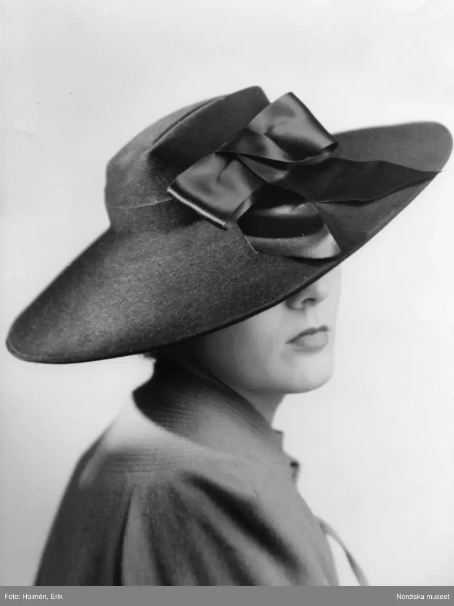 Kvinnlig modell med hatt i filt med silkesband. Nordiska Kompaniet, Stockholm.