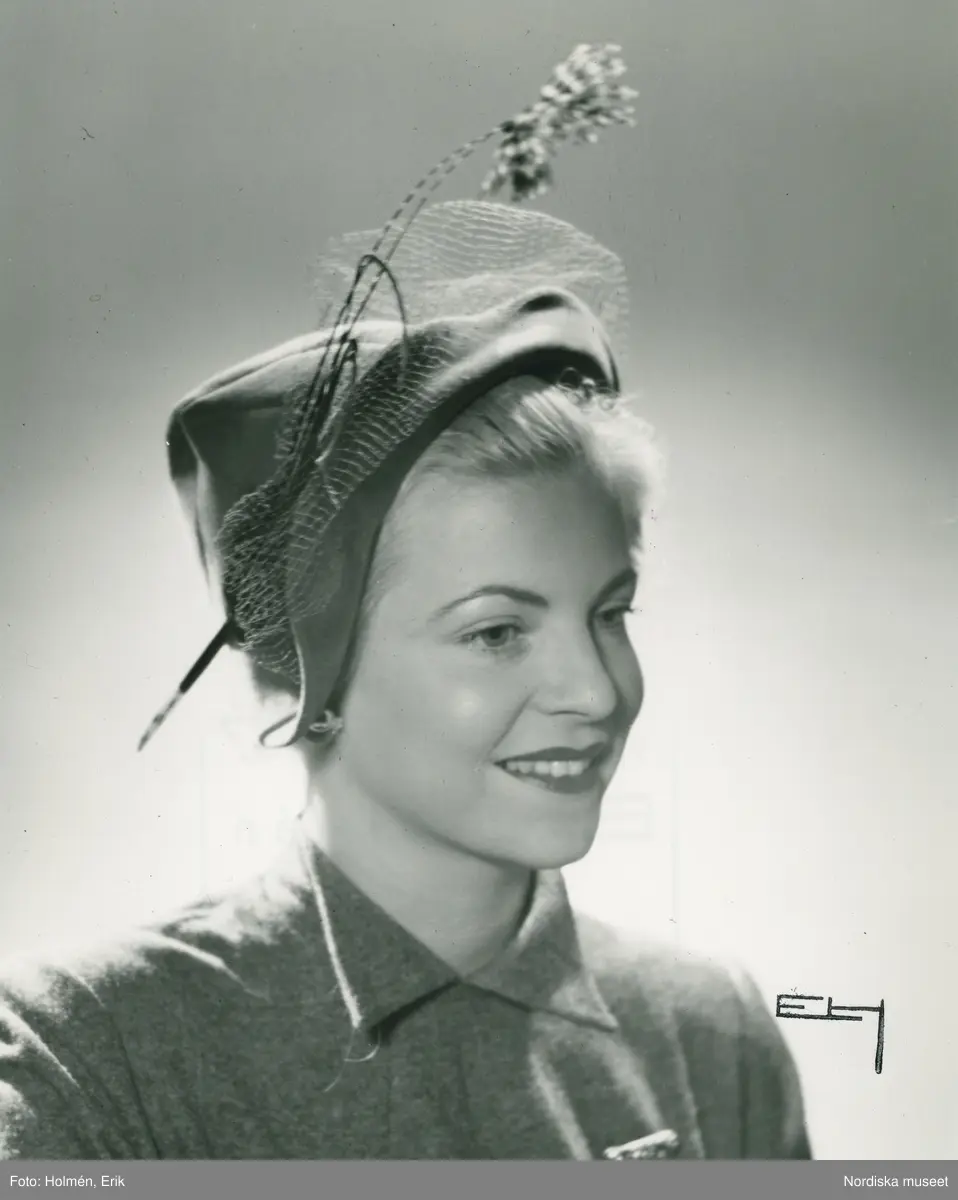 Porträtt av kvinna i guldbrun velourhatt med flor och fantasie, av Jacques Fath