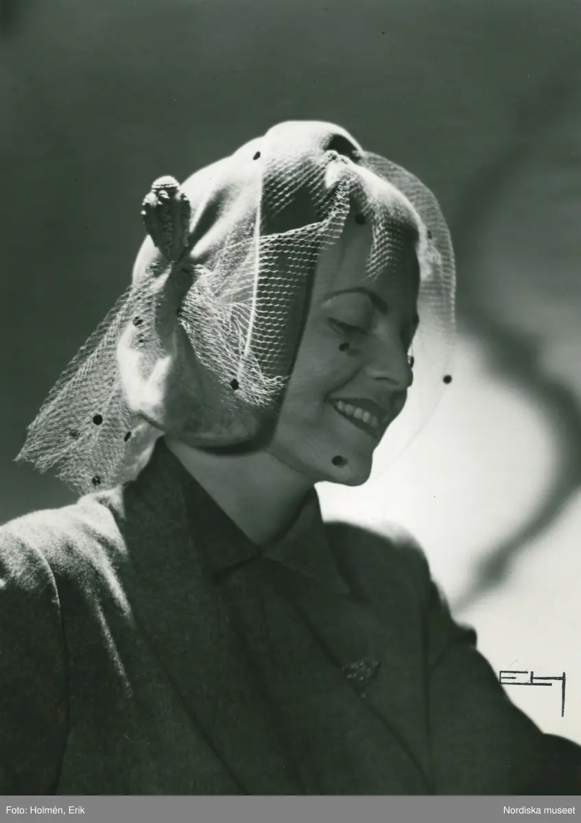 Porträtt av kvinna i beige velourhatt med flor i samma färg med svarta moucher, av Jacques Fath.