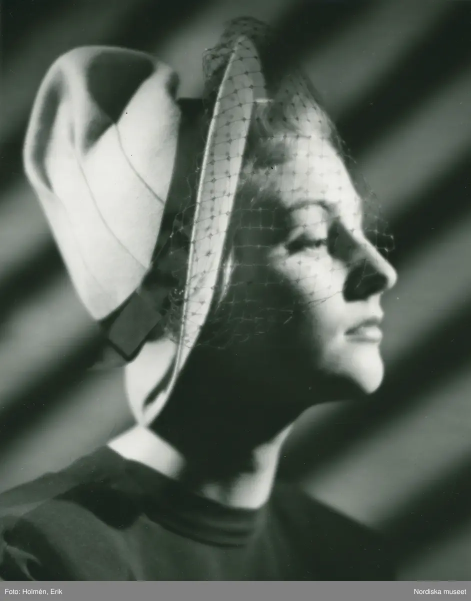 Porträtt av kvinna i hatt i svagt rosa filt med stickningar på kullen, garnerad med marinblått band av Claude St Cyr.