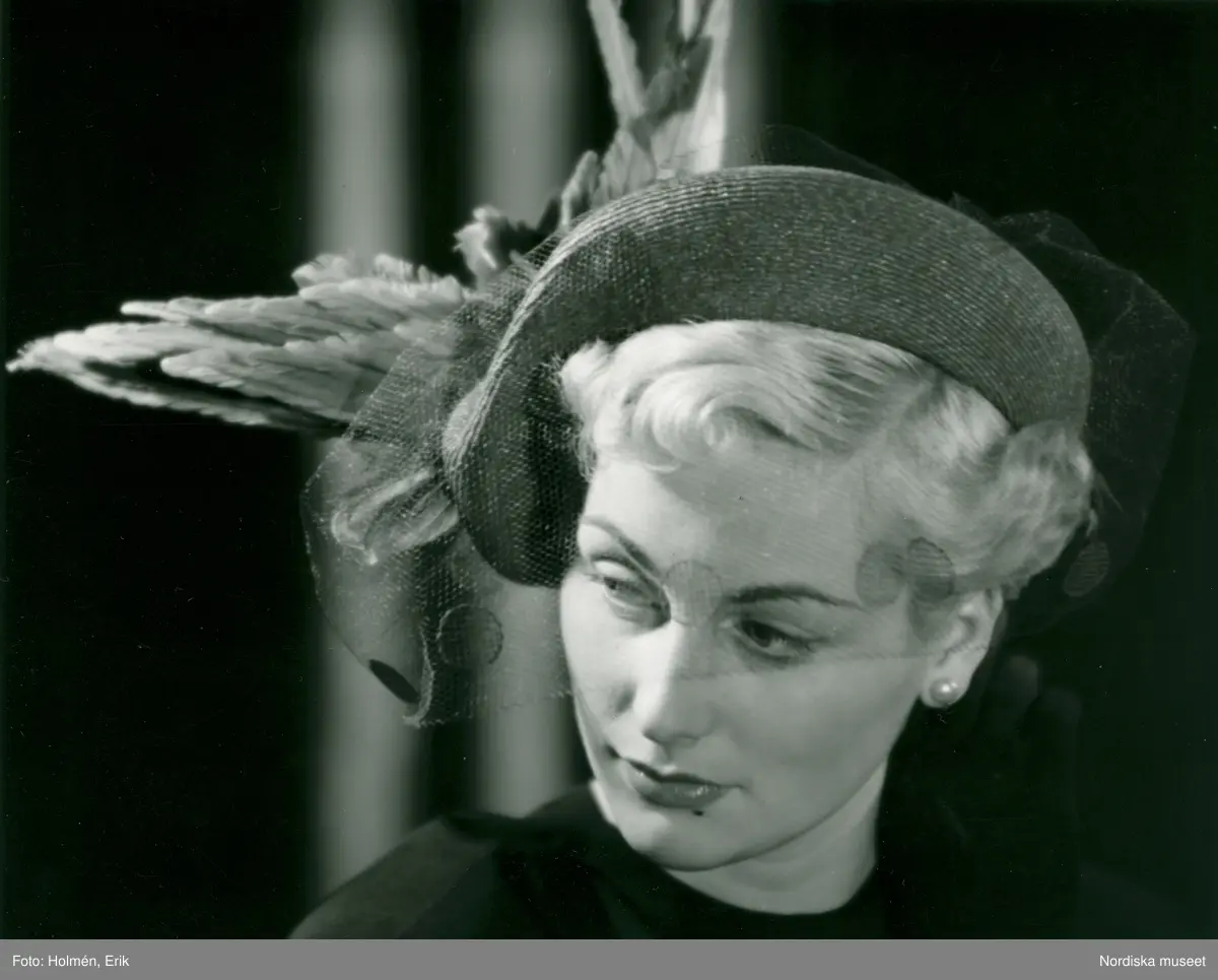 Porträtt av kvinna i duvblå stråhatt med vingar i samma färg, av Rose Valois.