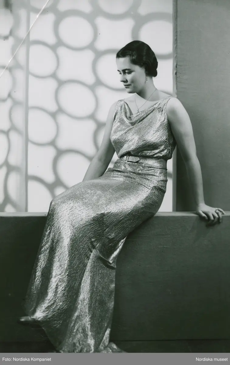 Helporträtt av fröken Hermine Tersmeden i balklänning i grön silverlamé, vid Amarantherbalen.