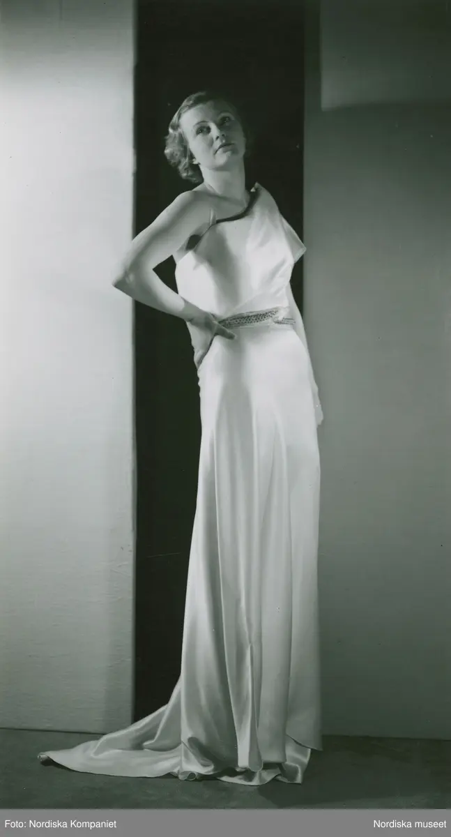 Modell i balklänning med släp i vitt blankt siden av Madame Vionnet.