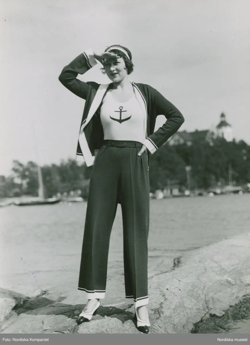Modell i linne, byxor, jacka, pumps och mössa i marin stil, vid Saltsjöbaden.