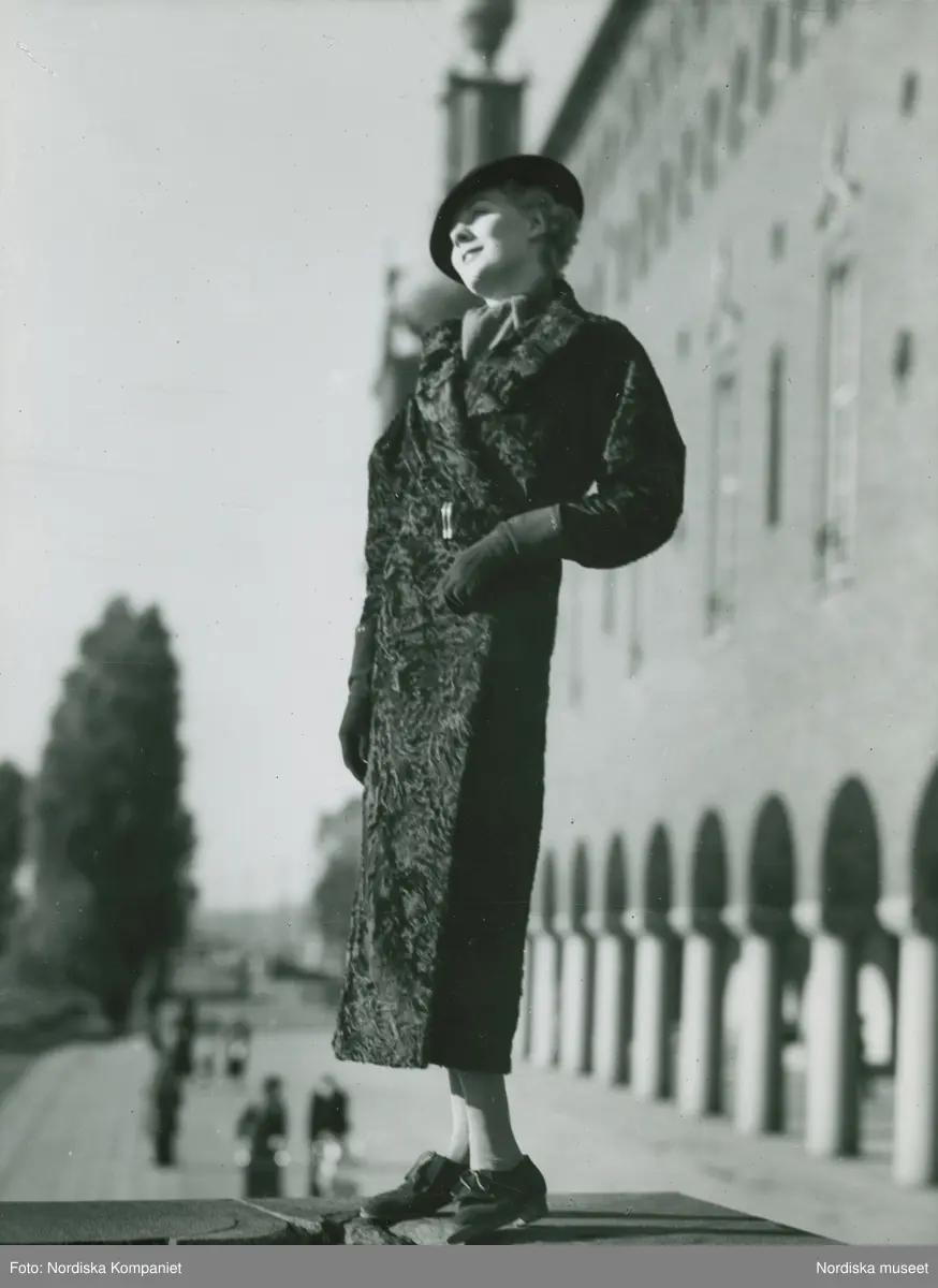 Modell i pälskappa och hatt utanför Stadshuset.