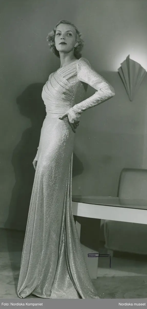 Modell i aftonklänning i guld- och silverlamé med draperad omlottskärning.