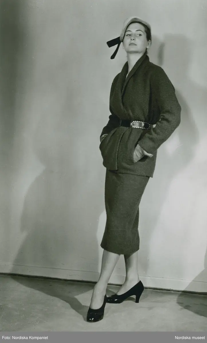 Modell i dräkt med skärp, hatt med dekorband och pumps, av Jacques Griffe.
