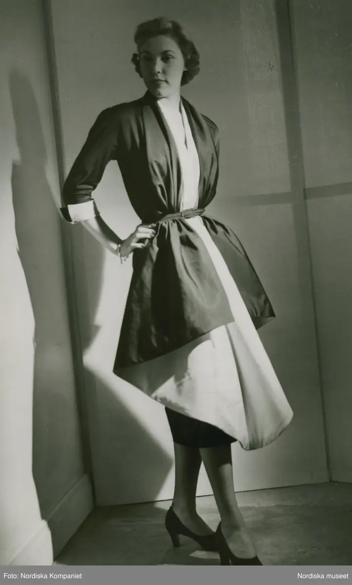 Modell i tvåfärgad klänning med skärp och pumps.