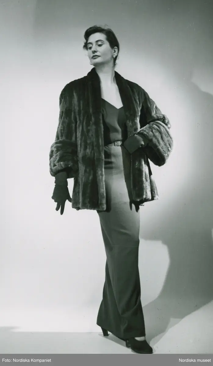 Modell i päls av rysk hermelin, klänning, handskar och pumps.