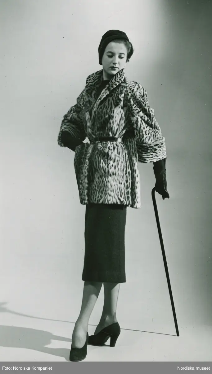 Modell i pälsjacka av ozelot, pennkjol, hatt, handskar, pumps och käpp.