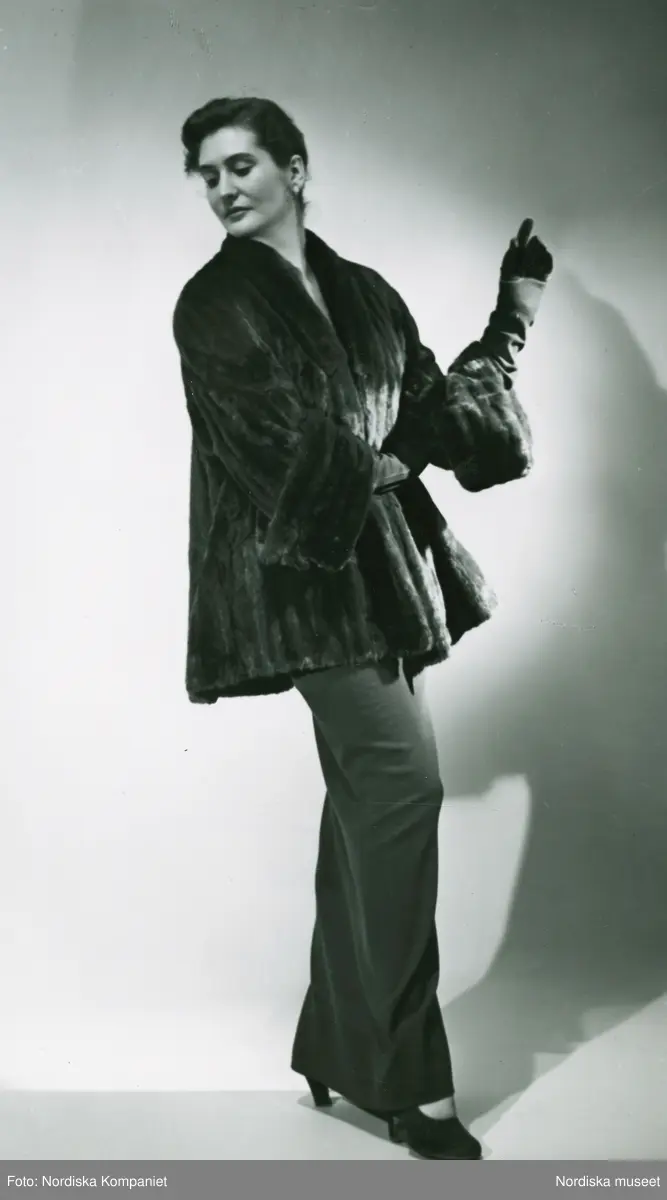 Modell i päls av rysk hermelin, klänning, handskar och pumps.