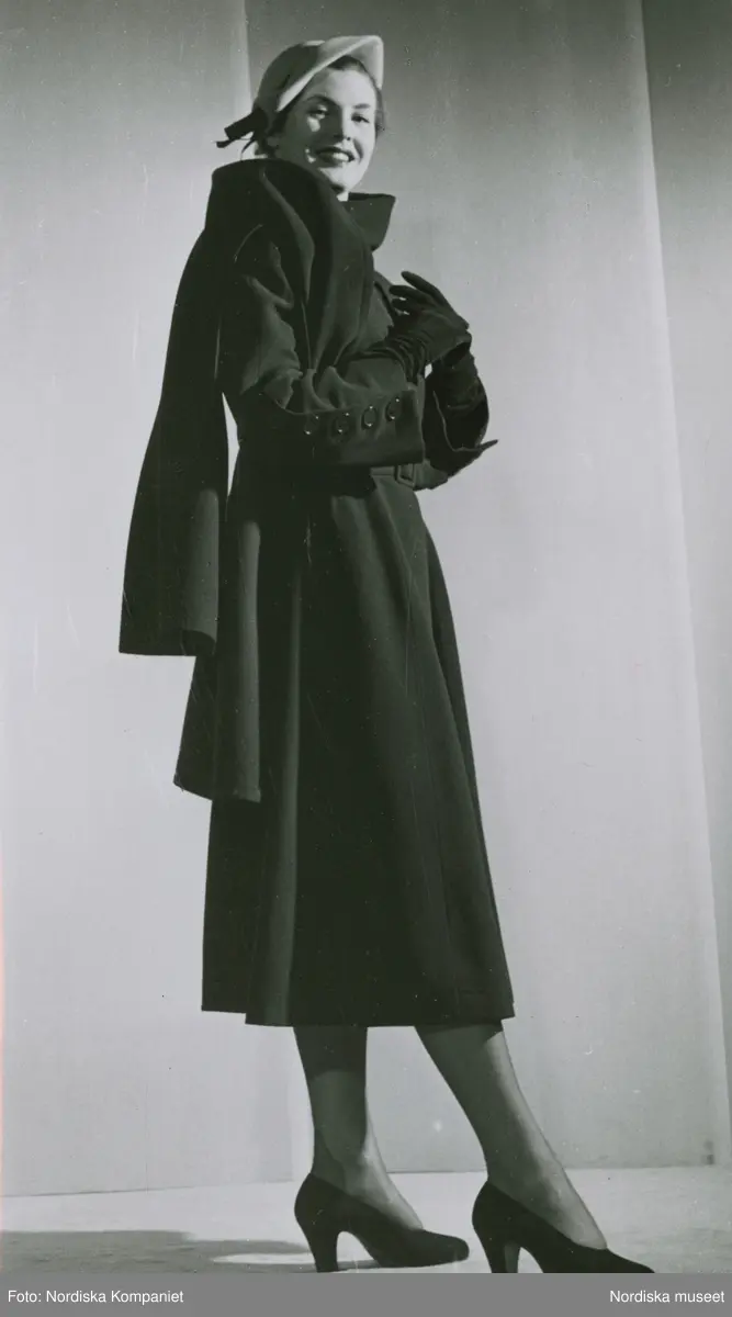 Modell i kappa med halsduk, hatt, handskar och pumps.