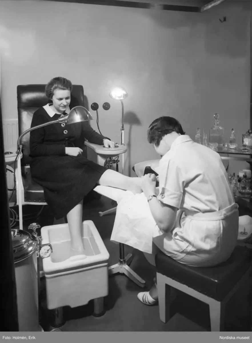 En dam som får pedikyr. Nordiska Kompaniet.