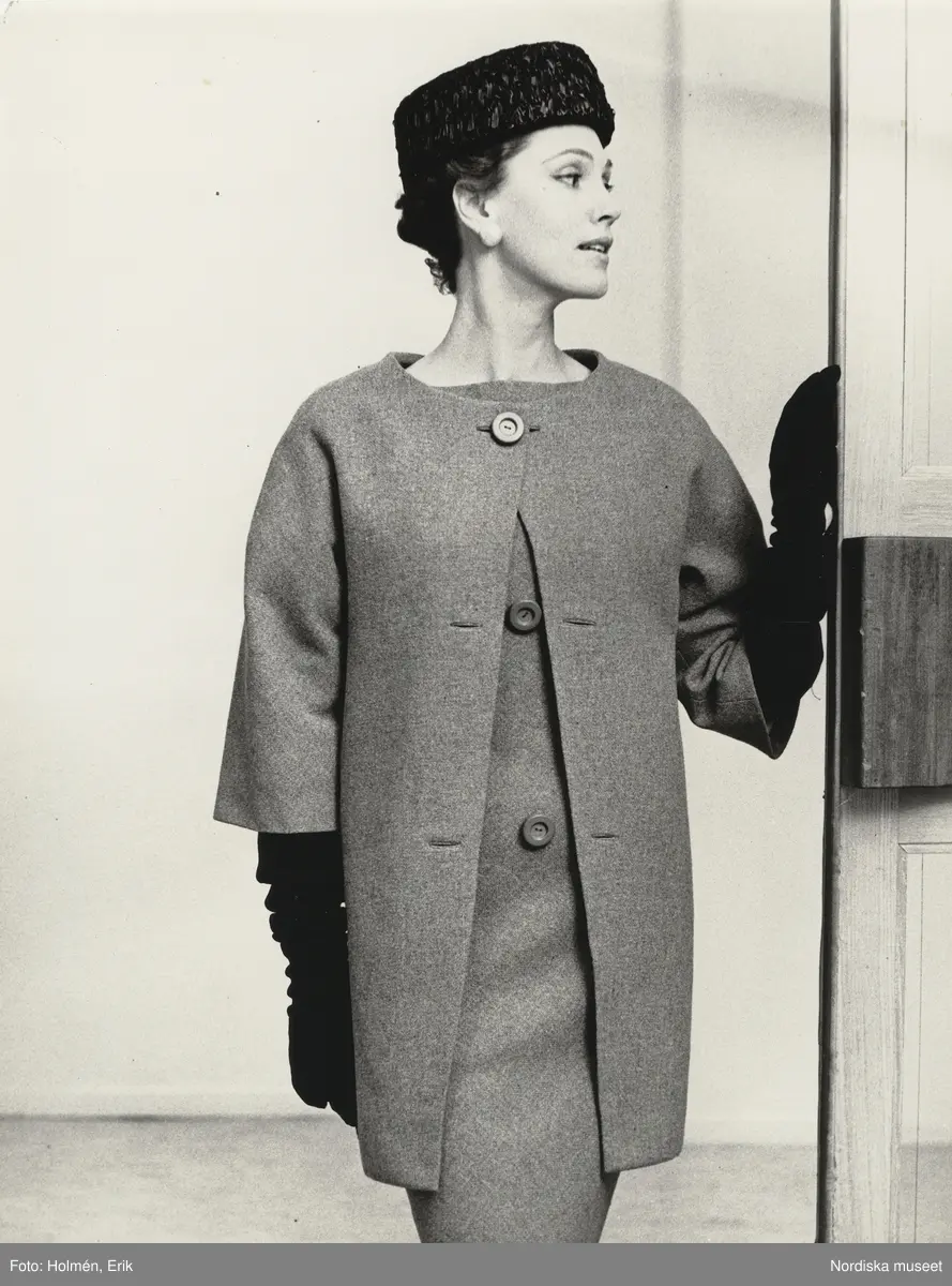 Modell i grå klänning, kappa och hatt. Original Givenchy.