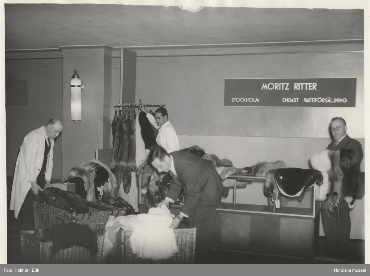 Förberedelser till pälsutställningen i Ostmans bilhall. Män hänger upp pälsar.