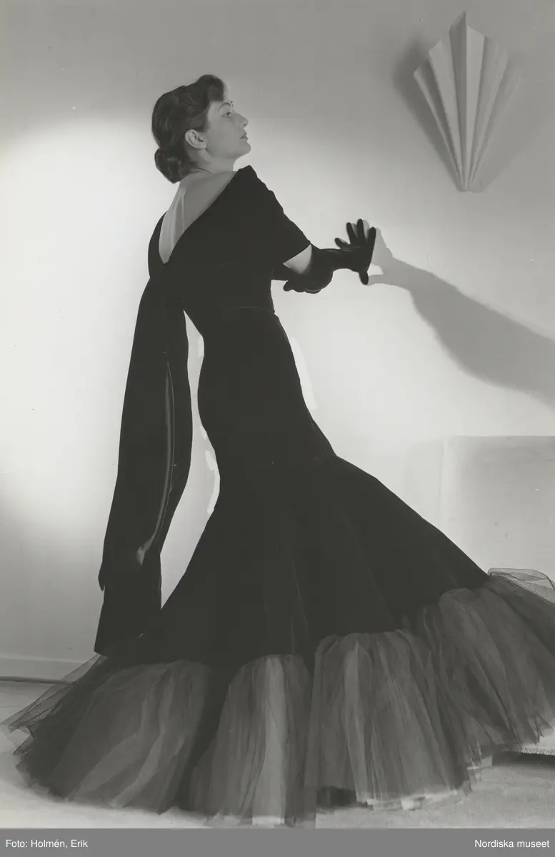 Modell i aftonklänning med tyll nedtill. Nordiska Kompaniet efter Balenciaga.