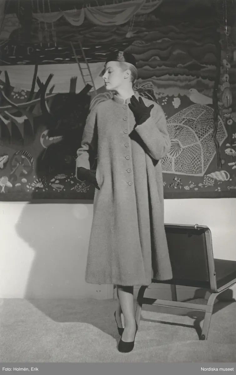 Modell i kappa, hatt och handskar framför textilkonstverk. Från Balenciaga.