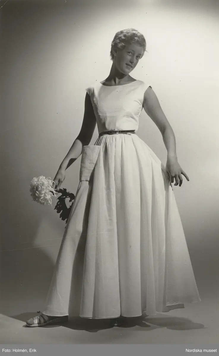 Tonårsmode, höst. Modell i klänning med skärp och ficka med blomma i handen.