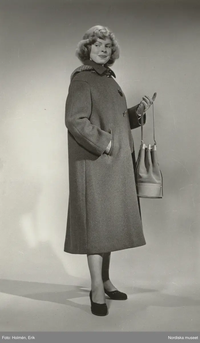 Tonårsmode, höst. Modell i kappa, handskar och handväska.