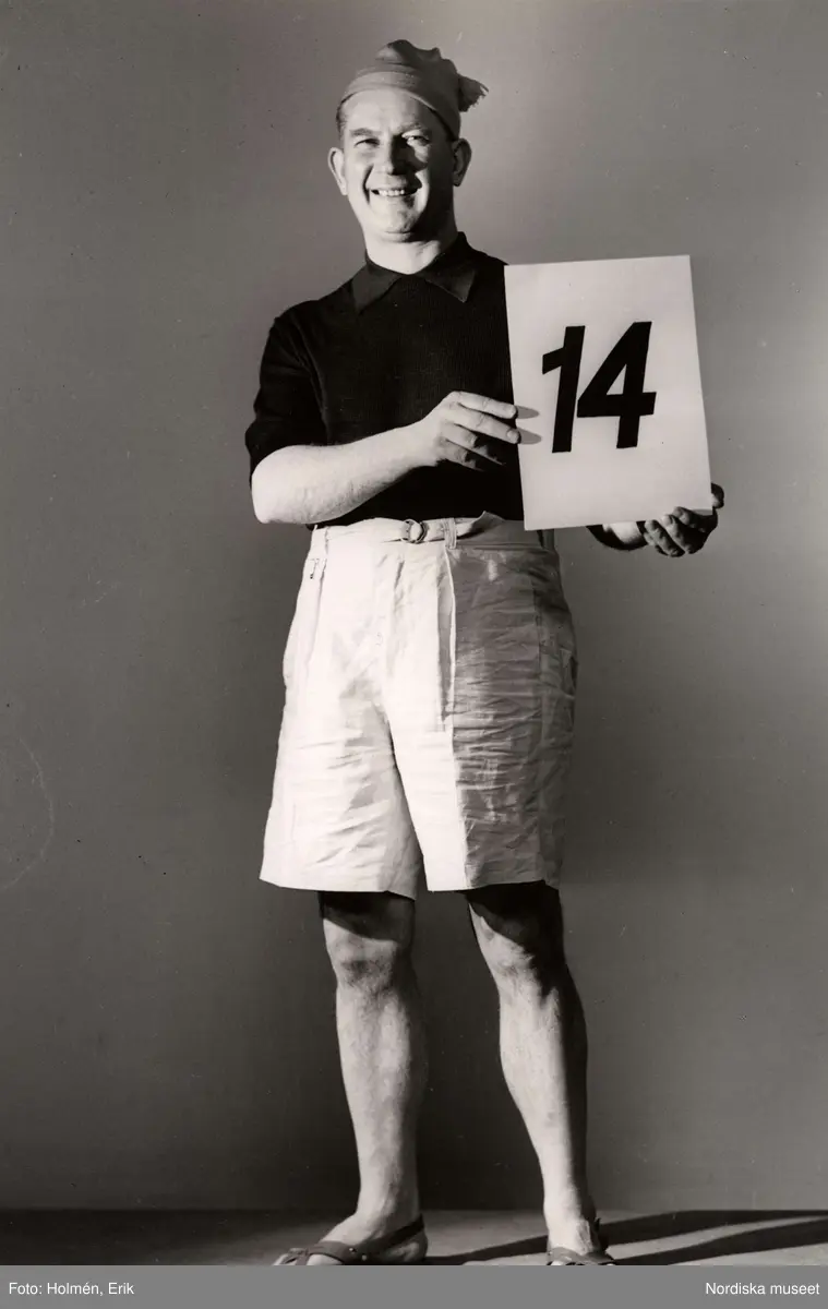 Nordiska Kompaniets kabaré april 1943. Man iförd shorts, kortärmad sportskjorta, sandaler och mössa med tofs. Han håller upp en skylt med talet 14.