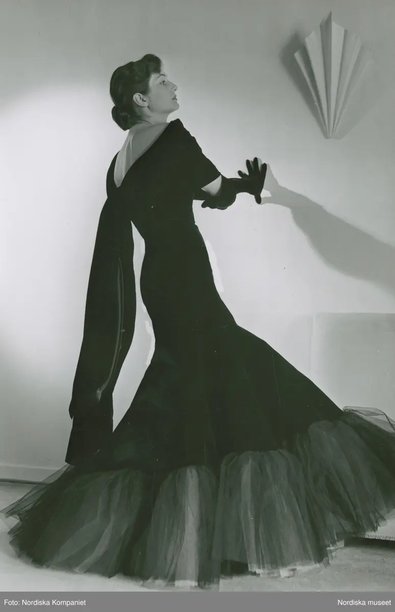 Modell i aftonklänning med volang av tyll, operahandskar. NK efter Balenciaga.